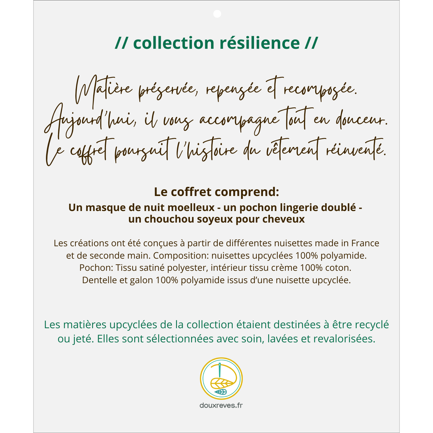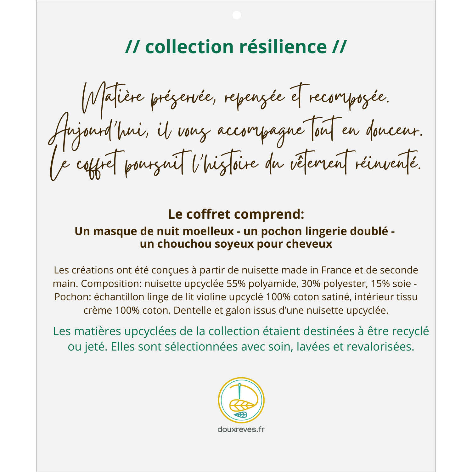 Résilience est une collection de créations textiles upcyclées, réalisées à partir de matières de seconde main sélectionnées avec soin, lavées et transformées.