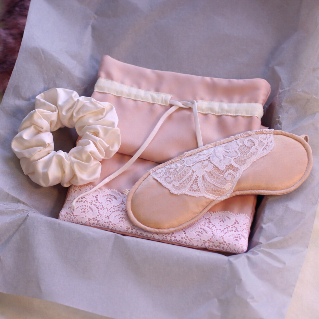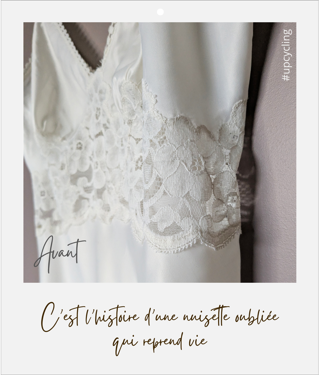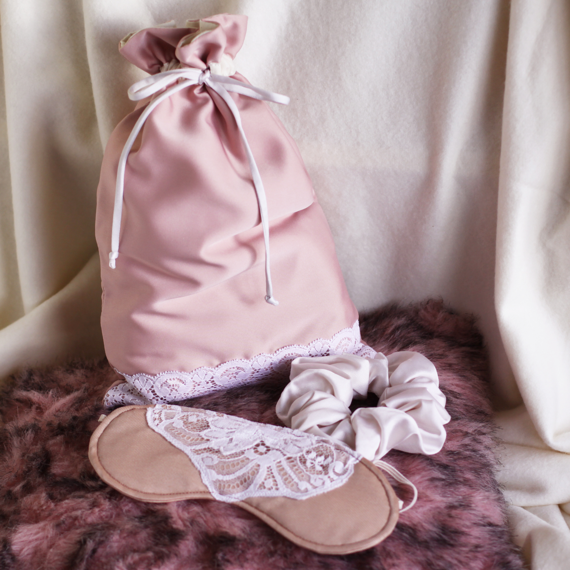 Pochon: Tissu satiné polyester, intérieur tissu crème 100% coton. Dentelle et galon 100% polyamide issus d’une nuisette upcyclée.