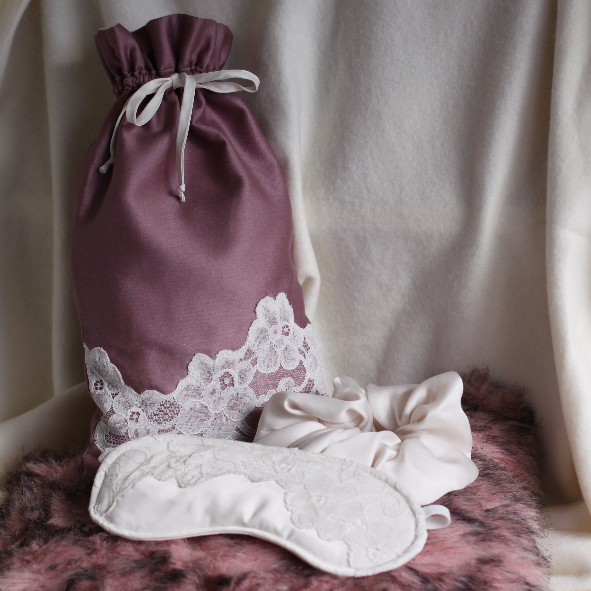Pochon: échantillon linge de lit violine upcyclé 100% coton satiné, intérieur tissu crème 100% coton. Dentelle et galon issus d’une nuisette upcyclée.